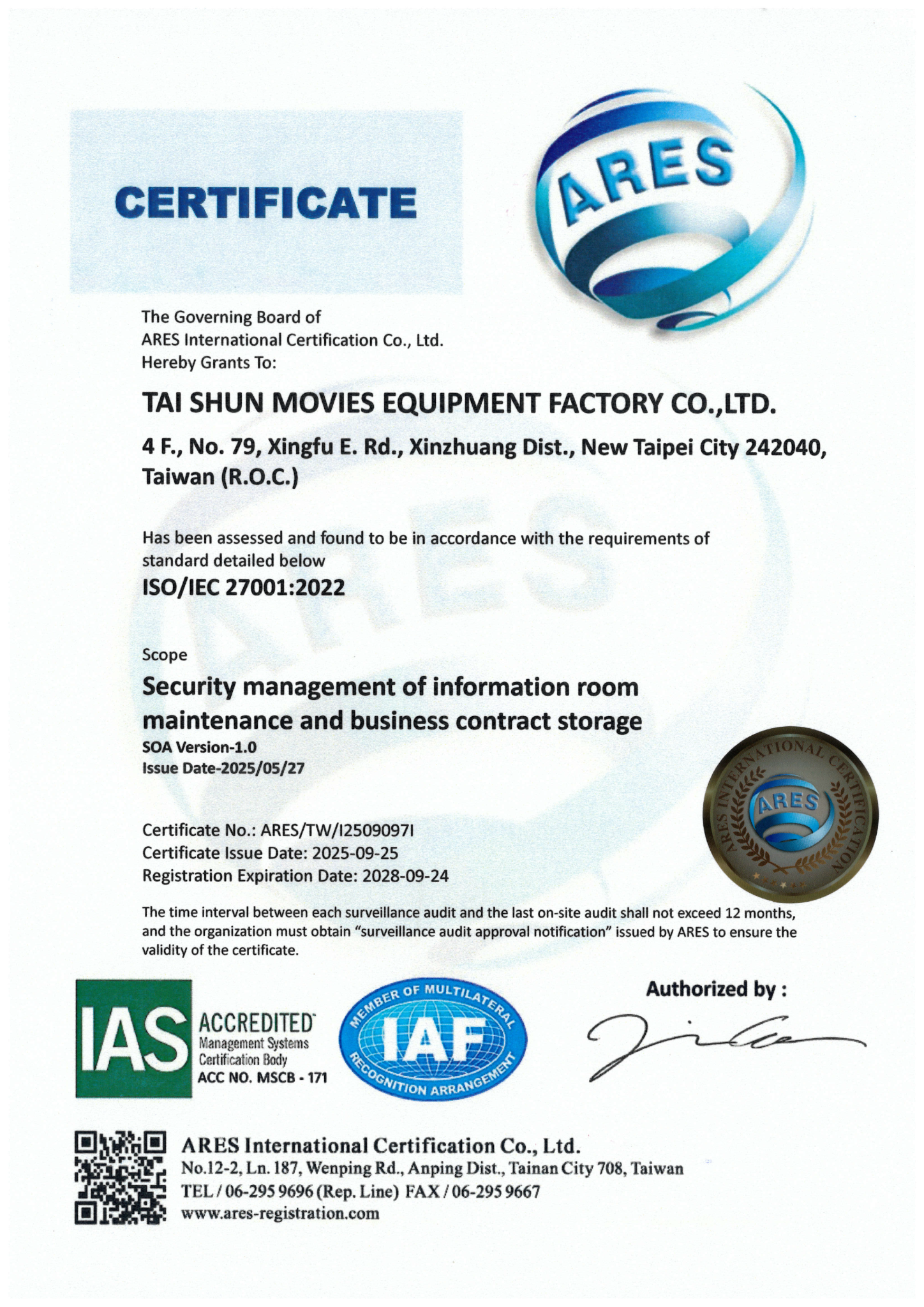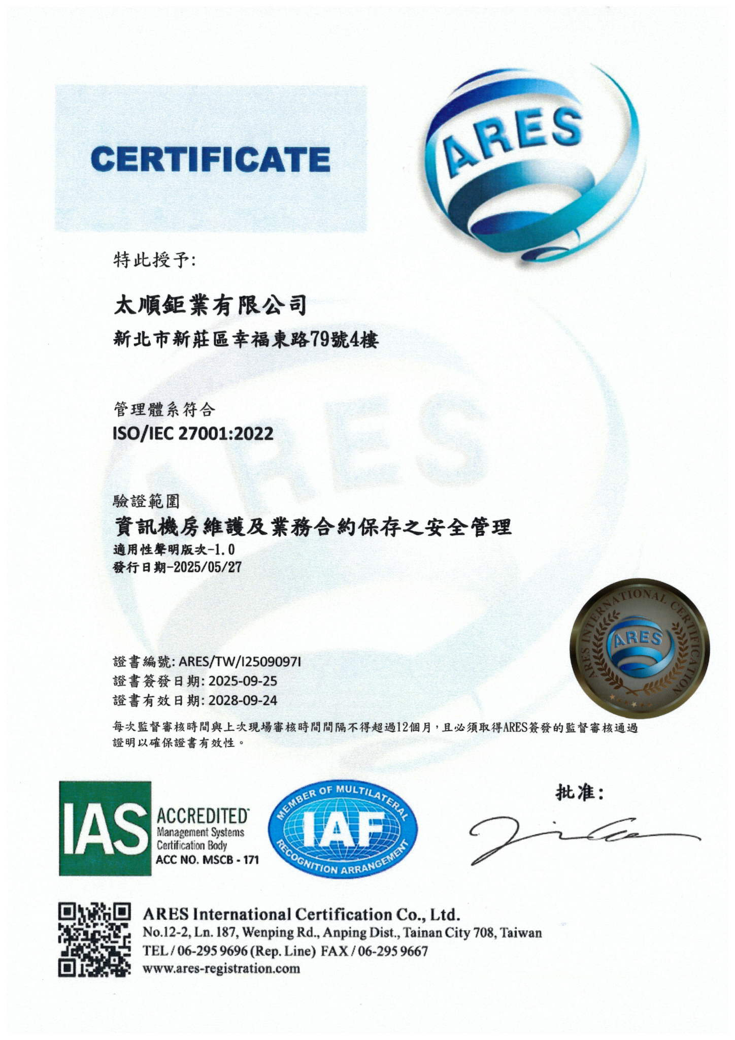 太順鉅業有限公司今(西元 2025 年 11 月 06 日)宣布,公司已於 2025 年 9 月 25 日 正式順利通過 ARES 審核簽署的 ISO/IEC 27001:2022 資訊安全管理系統最新版國際認證。這項認證肯定了太順鉅業在資訊資產管理、風險評估與處理、以及持續性安全控制方面的努力與成效,標誌著公司資訊安全管理體系已全面達到國際最高標準。以因應最新的資安挑戰。